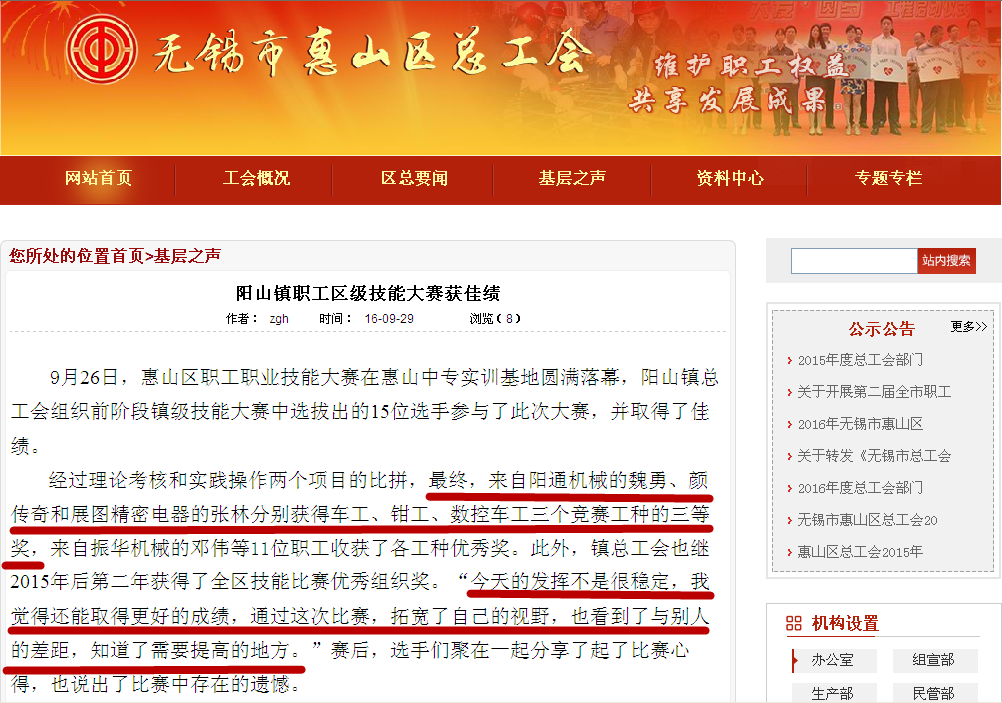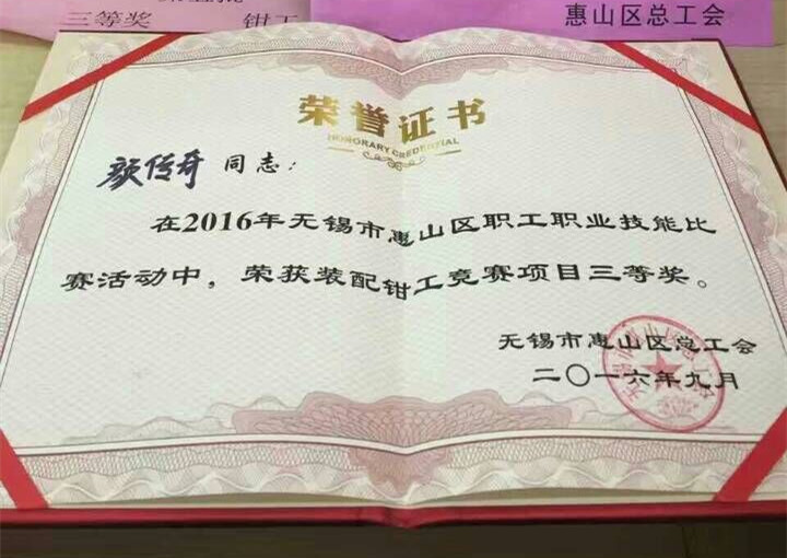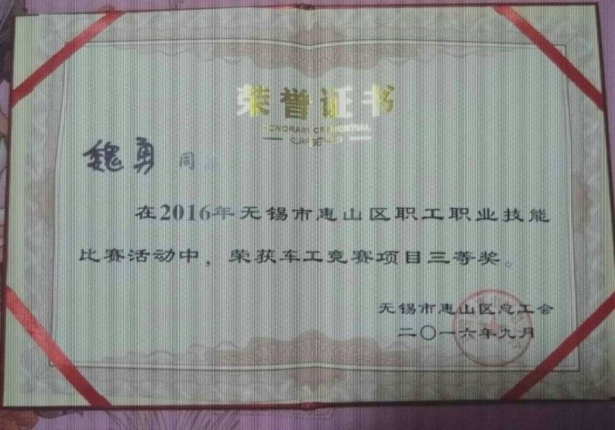 On September 26th, the 2016 Huishan Workers' Vocational Skills Competition started at the training base of Huishan Secondary Vocational School; Yan Zhuan, Wei Yong, who won the award at the end of the competition, published a commendation on the "Wuxi Huishan District Federation of Trade Unions" website . as the picture shows